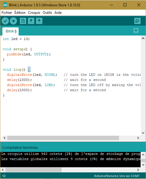 Son interface de codage est développé à partir d'une base de Processing, ce qui explique les ressemblances autant dans l'interface utilisateur que dans son utilisation. L'exemple de code ci-contre permet de faire clignoter une diode que l'on branche sur le port n°13 de la carte ainsi que sur la terre (ground) pour permettre l'alimentation de cette diode.