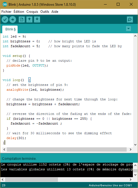 Dans cet exemple plus complet, l'intensité de la diode dépend de la variable brightness. Cette variable change toutes les 30 ms à chaque tour de la fonction loop.